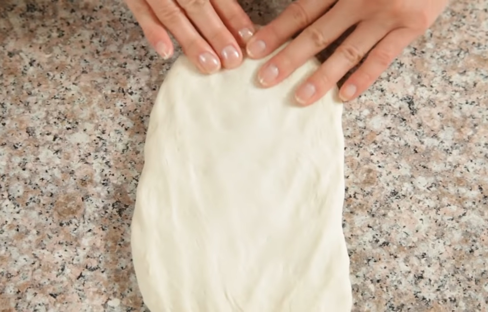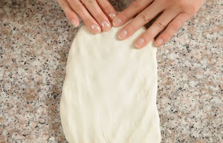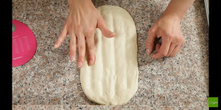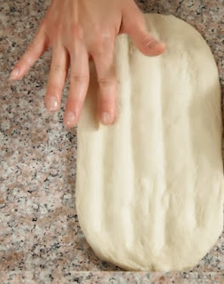Step4:- Ab dough ko bowl se nikal ke , dough ko 80 cm lamba aur 25 cm tak chauda flate shape denge , phir finger se lining mark banayenge
