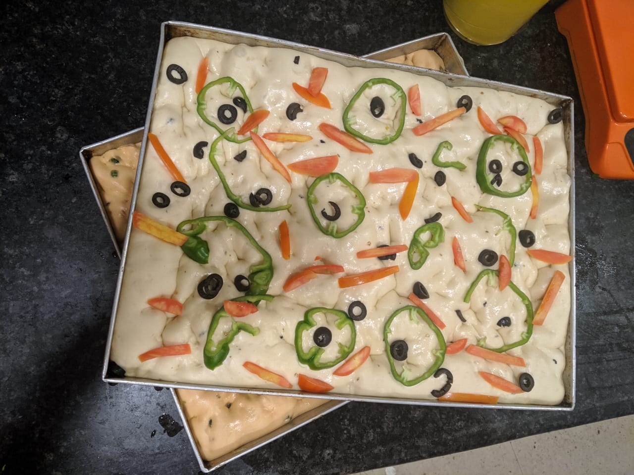 Ingredients:- Flour , olive oil , Yeast , salt, Gluten, Improver, starter, water , Rosemary, olives slice.