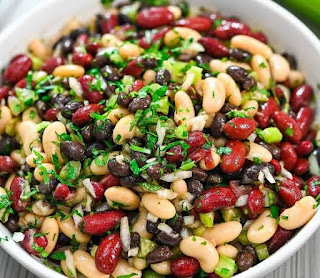2. Toss green and yellow beans with romano beans (or if using fresh, shell the fresh beans and simmer in salted water for 20 minutes, then drain and cool). Add onion and celery (or chopped lovage).