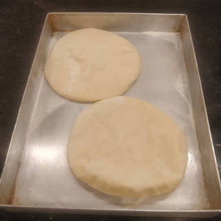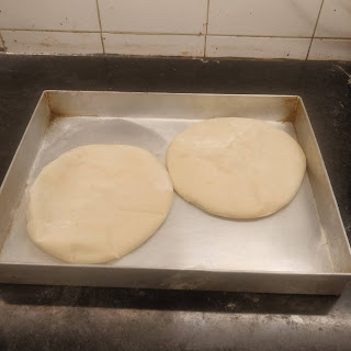 Step4:- Now roll the dough and make 3 mm sheet , now cut cut the sheet with 8 inch round cutter, and keeep the base in clean tray for proffing.